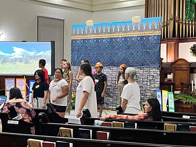 The leaders of Bible Release Time, Cynthia and Gary Akimseu, Meli Oshiro and myself got together and planned a graduation ceremony. The students’ graduation took place on July 24th, 2022, at Haili Congregational Church. Each student received a bible in a bible case and their kihei which they wore to the graduation. On each student’s kihei a symbol of the theme of what they learned each year were stamped on it. The kihei with its symbols will remind them of the lessons they learned while attending Bible Release. At their graduation the students sang a song and recited the scripture John 3:16 “For God so loved the world that He gave His only begotten Son, that whoever believes in Him shall not perish, but have eternal life.”